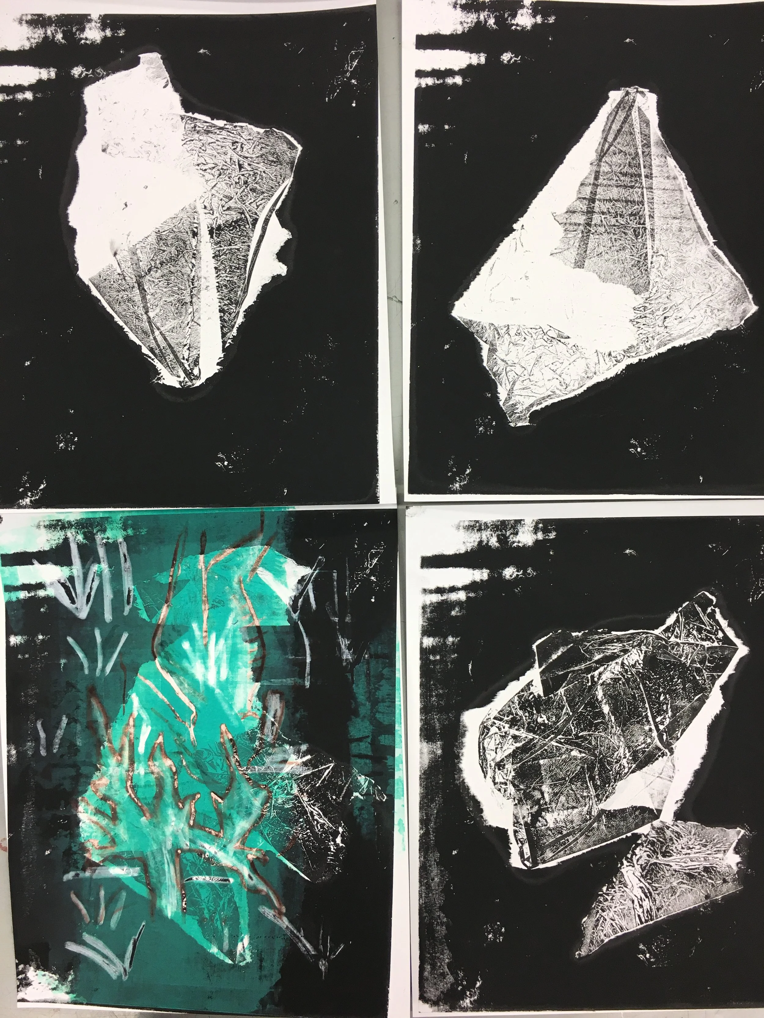 Screen-prints, lithography and photo-intaglio prints from a semester long Intro to Printmaking class I co-taught with my friend Monika at SAIC 2020.